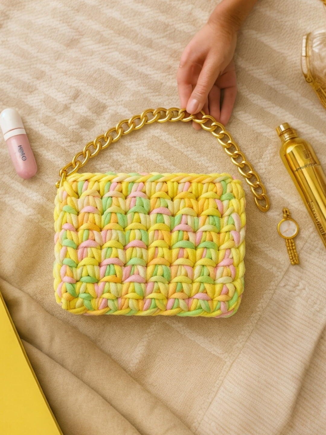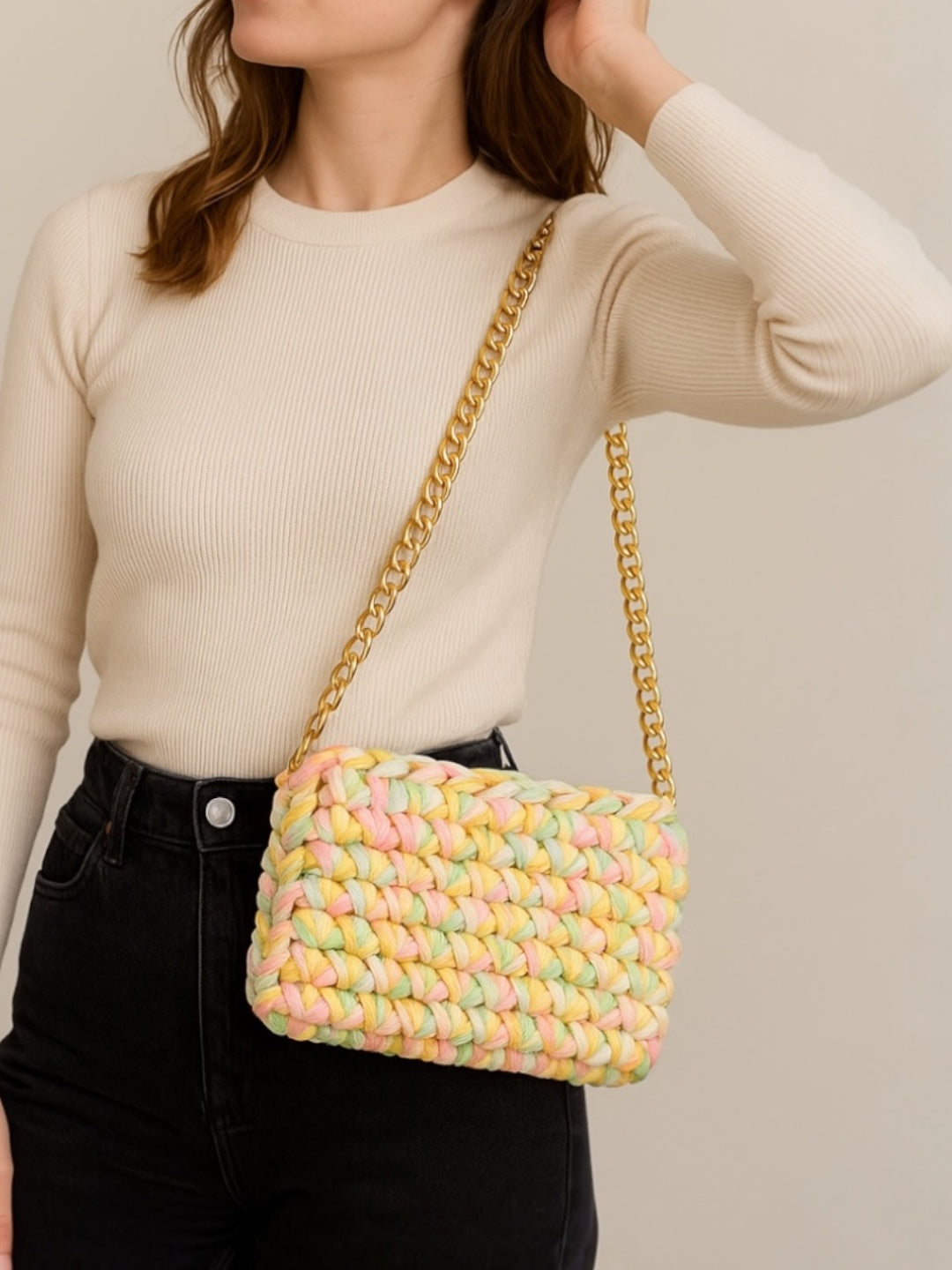 Add a pop of charm to your look with this beautifully handwoven multicolor bag. Crafted with soft, chunky yarn in pastel shades of pink, yellow, and green, it’s paired with a bold golden chain strap for a perfect mix of cozy and chic. Lightweight yet stylish, this bag is ideal for casual outings, brunch dates, or gifting to someone special.